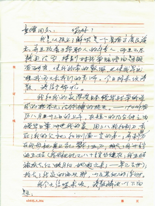 我是从报上了解你是一个具有高度民族感并且极善于帮助人的年青人,而且不尽精通法学,特别对战争赔偿问题颇有研究,使我非常的敬佩,也使我早就想找而又未找到的老师。今日特来信请教,请给予帮忙。