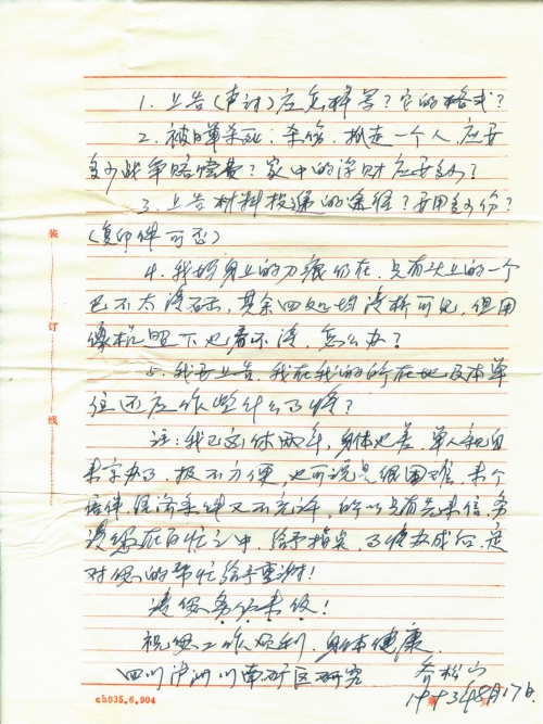 注:我已离休两年,身体也差,单人亲自来京办事,极不方便,也可说是很困难,来个信件,经济条件又不允许,所以只有先来信,务请您在百忙之中,给予指导,事情办成后,定对您的帮忙给予重谢!