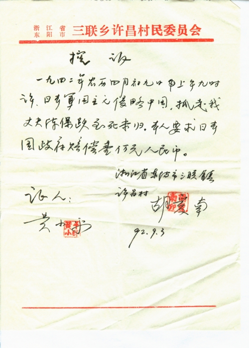 公元一九四二年农历四月初十日下午,日本军国主义侵略中国,将我祖父抓走做担夫,并将祖父饲养的一条大水牛的两条后腿割去,并将我祖母饲养的肉猪两头均割去后腿,其损失达贰仟叁佰余元,要求日本政府赔偿损失。