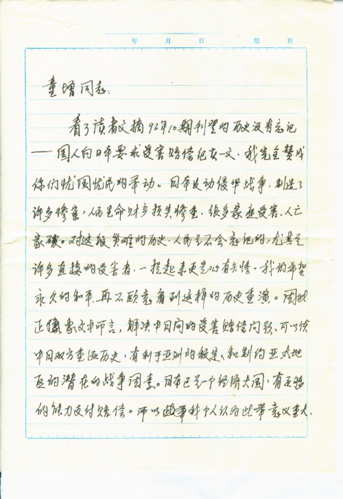 看了读者文摘92年10期刊登的历史没有忘记——国人向日本要求受害赔偿纪实一文。我完全赞成你们忧国忧民的举动。日本发动侵华战争,制造了许多惨案,人民生命财产损失惨重,很多家庭受害,人亡家破。对这段灾难的历史,人民是不会忘记的,尤其是许多直接的受试者,一提起来更是心有余悸。我们希望永久的和平,再不愿意看到这样的历史重演。因此正像文中所言,解决中日间的受害赔偿问题,可以使中日双方重温历史,有利于亚洲的稳定和制约亚太地区的潜在的战争因素。日本已是一个经济大国,有足够的能力支付赔偿。所以我个人认为此举意义重大,有利于中日两国人民的友好和长久和平,有利于子孙后代,一定会得到广大人民的支持。