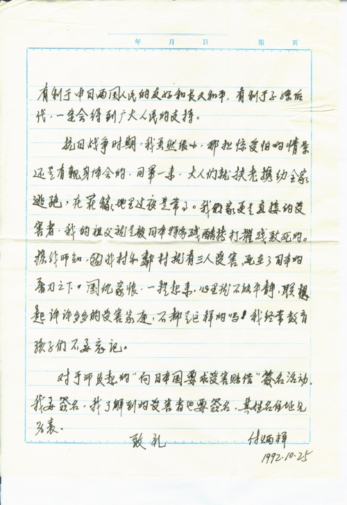 细节:我祖父在日本入侵我家乡时候被日军酷刑打死,我们应牢记。寄来支持对日索赔签名。