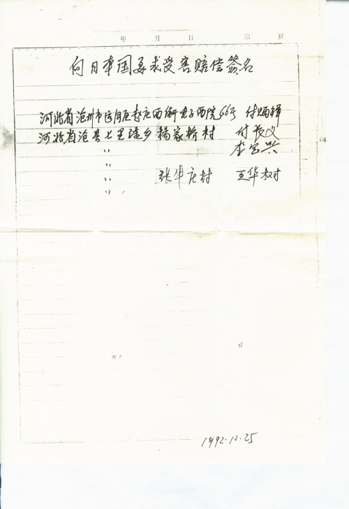 对于你所发起的“向日本国要求受害赔偿”签名活动,我要签名,我了解到的受害者也要签名,其姓名住址见另表。