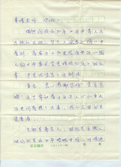偶然间我在92年10月甘肃人民出版社的杂志《读者文摘》中看到一篇名为《历史没有忘记——国人向日本要求受害赔偿纪实》的文章,于是给您写了这封信。