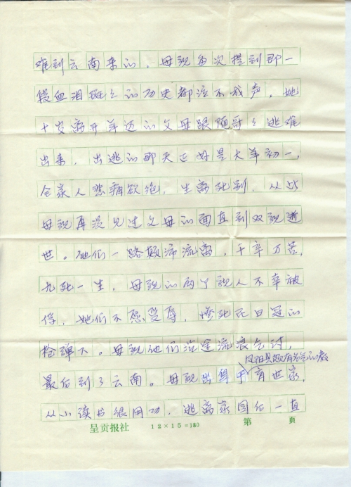 父亲是南京人,母亲是安徽人,他们就是在日本侵略中国的时候逃难到云南来的,母亲每次提到那一段血泪斑斑的历史都泣不成声,她十岁离开年迈的父母跟随哥哥逃难出来,出逃的那天正好是大年初一,全家人悲痛欲绝,生离死别,从此母亲再没见过父母的面直到双亲逝世。他们一路跌沛流离,千辛万苦,九死一生,母亲的两个亲人不幸被俘,她们不愿受辱,惨死在日寇的枪弹下。母亲他们沿途流浪乞讨,最后到了云南。母亲出身于凤阳县颇有名气的教育世家,从小读书很用功,逃离家园后一直没能读书,每每感到终身遗憾。关于母亲的家庭和两位巾帼英雄的事迹,现凤阳县志有记载。