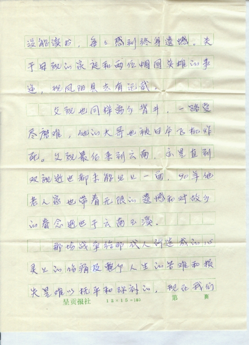 父亲也同样离乡背井,一路受尽磨难,他们的大哥也被日本飞机炸死。父亲最后来到云南,亦是直到双亲逝世都未能见上一面,90年他老人家也带着无限的遗憾和对故乡的眷念逝世于云南玉溪。