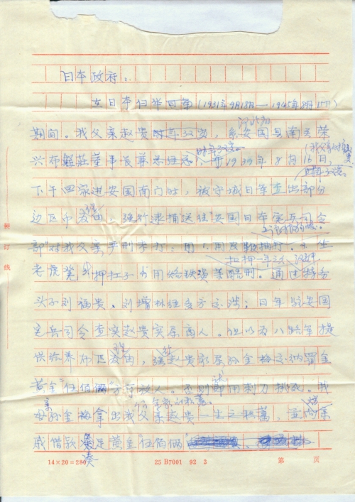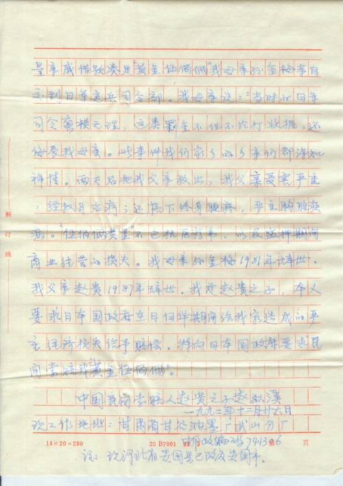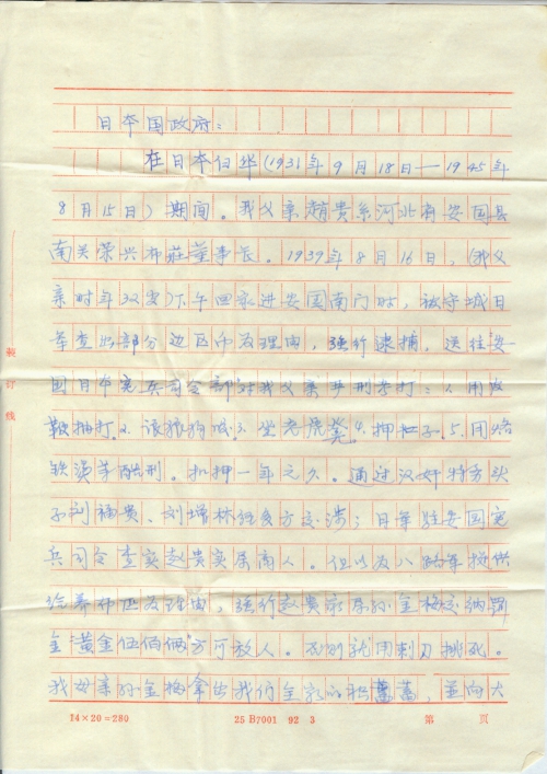 在日本侵华(1931年9月18日——1945年8月15日)期间。我父亲赵贵系河北省安国县南关荣兴布庄董事长。1939年8月16日,(我父亲时年32岁)下午回家进安国门时被守城日军查出部分边区币为理由,强行逮捕,送往“安国日本宪兵司令部”对我父亲严刑拷打:1、用皮鞭抽打。2、让狼狗咬。3、坐老虎凳。4、押杠子。5、用烙铁烫等酷刑。扣押一年之久。通过汉奸特务头子刘福贵、刘增林经多方交涉;日军驻安国宪兵司令查实赵贵实属商人。但以为八路军提供给养布料为理由,强行赵贵家属孙金梅交纳罚金“黄金五百两”方可放人。否则就用刺刀挑死。我母亲孙金梅拿出我们全家的积蓄,并向大量亲戚借款凑足“黄金五百两”我母亲孙金梅亲自交到日本宪兵司令部。我母亲说:“当时的日军司令蛮横无理,这类罚金不但不给打收据,还侮辱我母亲。此事件我家乡的乡亲们都深知详情。两天后我父亲放出,我父亲受害严重,经数月治疗;还落下终身腿疼,严重胸腔疾病。“五百两黄金”不包括医疗费,以及监押期间商业经营的损失。我母亲孙金梅1981年辞世。我父亲赵贵1987年辞世。我是赵贵之子,本人要求日本国政府在日侵华期间给我家造成的严重经济损失给予赔偿。特向日本国政府要求民间索赔我“黄金伍百两”。