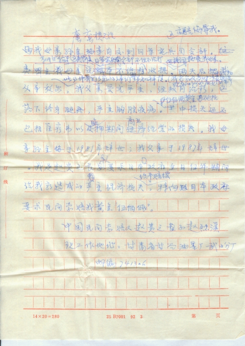 二、是否由本人直接向日本政府写书面民间索赔材料。(付本人写的材料一份)