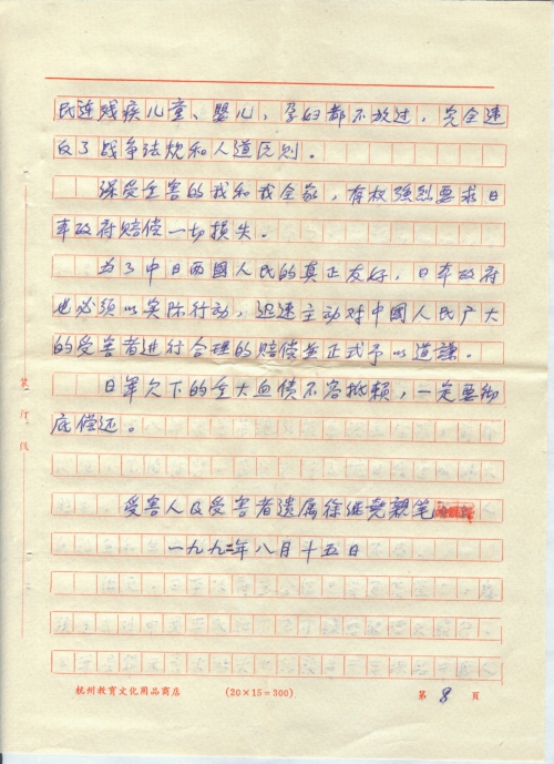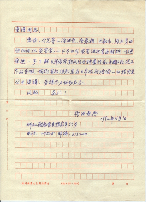 今先寄上徐继尧、唐惠根、王新昌、张玉芳四位民间受害者1-4号四份受害经过书面材料,以便您进一步了解日军侵华期间的各种暴行和中国人民说不尽的苦难,我们有权强烈要求日本政府赔偿一切损失,并公开道歉,务请尽力协助为感。