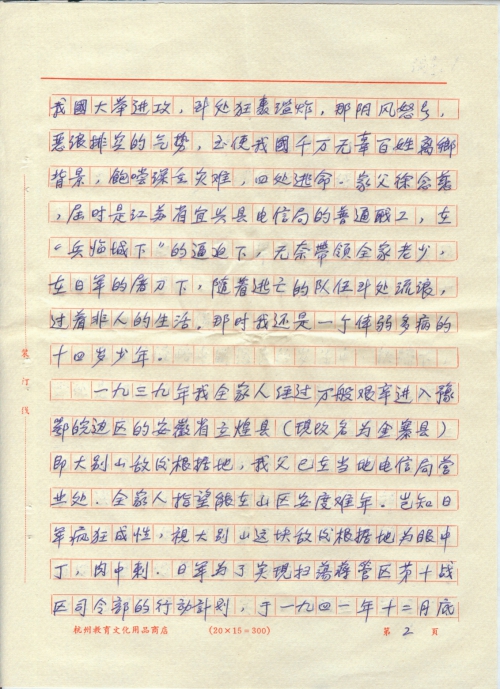 一九三七年日本帝国主义者妄图并吞中国而发动全面侵华战争的初期,凭着军国主义野心早已阴谋准备好的实力,海陆空三军同时向我国大举进攻到处狂轰滥炸,那阴风怒号,恶浪排空的气势,致使我国千万无辜百姓离乡背景(“景”编辑为“井”),饱尝深重灾难,四处逃命。家父徐念慈,届时是江苏省宜兴县电信局的普通职工,在“兵临城下”的逼迫下,无奈带领全家老少,在日军的屠刀下,随着逃亡的队伍到处流浪,过着非人的生活,那时我还是一个体弱多病的十四岁少年。
