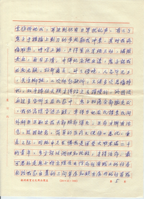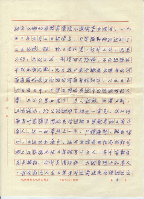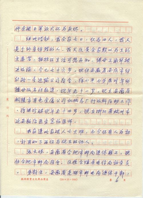 一九三九年我全家人经过万般艰辛进入豫鄂皖边区的安徽省立煌县(现改名为金寨县)即大别山敌后根据地,我父已在当地电信局营业处,全家人指望能在山区安度难年。岂知日军疯狂成性,视大别山这块敌后根据地为眼中丁(“丁”编辑为“钉”),肉中刺,日军为了实现扫荡蒋管区第十战区司令部的行动计划,于一九四一年十二月底秘密从湖北省滕家堡绕小道偷袭立煌县,一九四二年元月二日被侵占。日军随即疯狂进行了三天的烧、杀、抢三光政策,所到之处,无恶不作,无所不为。制造特大恐怖,不及逃脱的平民死伤无数,元月五日鬼子撤离立煌县向河南省固始县方向转回河南省信阳市,从五日至六日两天中,日军至固始县途中发现逃难的人群,又不分男女老少,见人就杀,近者刀刺,远者枪击,沿公路逃难百姓无一幸免。仅从河南省叶家集至固始县沿途被日军杀害的又有千余人,这一地带焦土一片,尸横遍野,触目惊心。在这次扫荡中,还有立煌县电信局的部分职工及家属也被日军杀害十余人,其中有报务员吴振钧、会计员周经枢、出纳员陈士和等人。我全家七人在日军未到达前连夜仓惶出逃出立煌县,好不容易才逃到河南省固始县附近时,(离立煌县并不远)早已精疲力倦,天昏地转。由于一家人拖儿带女,行走困难,终于被日军追上,这伙灭绝人性的恶狼,竟开枪射杀我年仅七岁腿残体弱的徐小毛弟弟,弹穿大脑,未吭一声,血流满地,当即身亡。于此同时弹雨中子弹击穿我头颈,右肩皮肉全被子弹削去,肩骨暴露,脸部太阳穴和头顶也受到飞来小块弹片,当即重伤倒在血泊中。我父亲徐念慈和十七岁的徐有根弟弟当场被日军抓去,次日就和另外被抓住的几十个平民押在公路边,全身被强行剥光衣服,时值冬天,于寒风凛冽中用刺刀都活活戳死、冻死。我父被日军连刺七刀,身体多处刺穿,死前地上挣扎,浑身泥血。有根弟被刺刀乱戳,胸有窟窿,惨状难睹。我受重伤倒地后,耳边则仍有日军扰乱声,有三个鬼子手握插上刺刀的步枪朝我冲来,其时我疼痛难熬,呼哼不能,只得紧压牙根不动,满脸是血,面目不清,中弹处衣被血透,鬼子认我必死无疑,故即离去,到了傍晚,人感到无力,头重脚轻,二次爬起跌倒,又经多次忍痛挣扎,双手捧住头颈才得站立支撑慢行,终因流血过多昏倒在农民家中,鬼子扫荡全部撤走后,我仍高烧昏迷不醒,幸得当地农民请来民间外科医生取出我头部脸部弹片,生命才渐有活气,然因缺药,简单的医疗又使伤口恶化,重危之际,同胞中兄长怜我是深受大难未满二十的青年,多方设法调理和抢救,才得活命,最可恶的是鬼子将立煌县电信局所有职工的住房包括我家自盖的三间草屋和锁在屋内的所有物件全被日军放火化为灰烬。