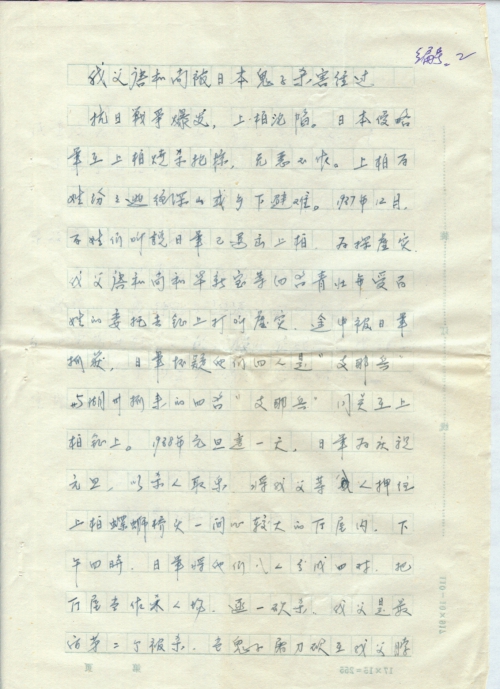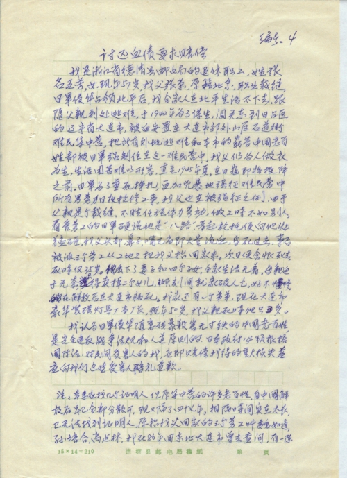 我是浙江省德清县邮电局的退休职工,姓张名玉芳,女,现年57岁,我父张荣,原籍北京,职业裁缝,日军侵华占领北平后,我全家人在北平生活不下去,跟随父亲到处逃难,于1942年为了谋生,闯关东到日占区的辽宁省大连市,被迫安置在大连市郊外山区石道街难民集中营,把所有外地逃难和本市的穷苦中国老百姓都被日军强制住在这一难民营中,我父仍为人做衣为生,生活困苦难以形容,直至1945年夏,在日寇即将投降之前。日军为了垂死挣扎,更加凶暴地强征难民营中所有男劳动力,日夜抢修工事,我父也在被强征之列。由于父亲是个裁缝,不胜任强体力劳动,做工时不如别人,看管劳工的日军硬说他是“八路”,举起枪托便向他头上猛砸,我父头部、鼻子、嘴巴当即大量流血,昏死过去,事后被派三个劳工从工地上把我父抬回家来。次日便含恨死去,死时仅35岁。他丢下妻子和四个子女,全家生活无着,母亲迫于无奈,只得卖掉二个女儿,顷刻间就家破人亡,好不凄惨。她在解放后在大连市病死。我家还有一个弟弟,现在大连市豪华装潢灯具厂当厂长,现年50岁,我父亲死时他只3岁。