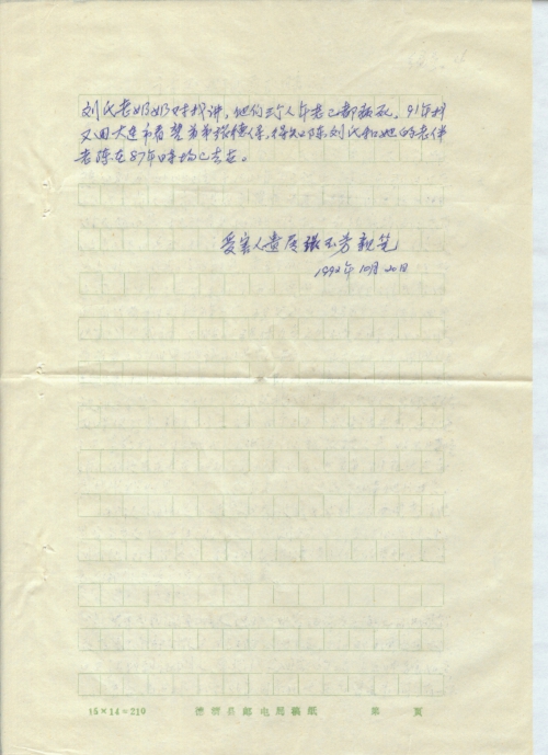 注:本来应找几个证明人,但原集中营的许多老百姓,自中国解放后早已全部分散开,现又隔了四十七年,相隔时间实在太长,已无法找到证明人,原抬我父回家的三个劳工叫魏如通,孙培合,高建林,我在86年回东北大连市曾去查问,有一陈刘氏老奶奶对我讲,他们三个人年老已都病死,91年我又回大连市看望弟弟张德保,得知陈刘氏和她的老伴老陈在87年时均已去世。