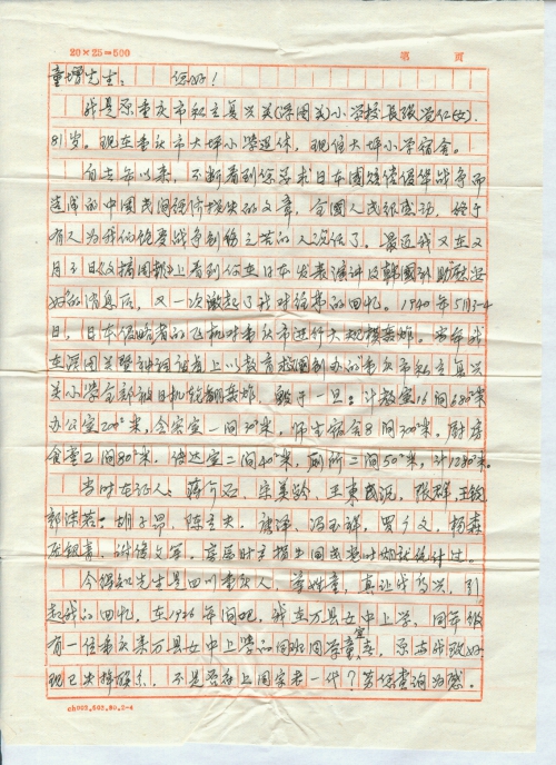 自去年以来,不断看到您要求日本国赔偿侵华战争而造成的中国民间经济损失的文章,全国人民很感动,终于有人为我们饱受战争创伤之苦的人说话了。最近我又在2月3日《文摘周报》上看到你在日本发表演讲及韩国补助“慰安妇”的消息后,又一次激起了我对往事的回忆。1940年5月3-4日,日本侵略者的飞机对重庆市进行大规模轰炸。当年我在浮图关暨神祠废墟上以教育救国到办的“重庆市私立复兴关小学”全部被日军轮[番]轰炸,毁于一旦:计教室16间680㎡办公室200㎡,会客室一间30㎡,师生宿舍8间300㎡,厨房食堂2间80㎡,传达室二间40㎡,厕所二间50㎡,计1280㎡。