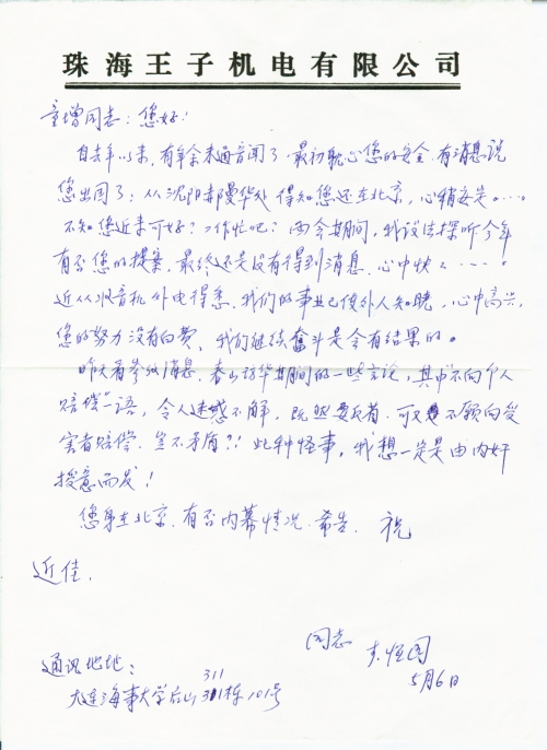 自去年以来,有年余未通音闻了,最初[担]心您的安全,有消息说您出国了:从沈阳郝曼华处得知您还在北京,心稍安定……。不知您近来可好?工作忙吧?两会期间,我设法探听今年有否您的提案,最终还是没有得到消息,心中怏怏……。近从收音机外电得悉,我们的事业已使外人知晓,心中高兴,您的努力没有白费,我们继续奋斗是会有结果的。