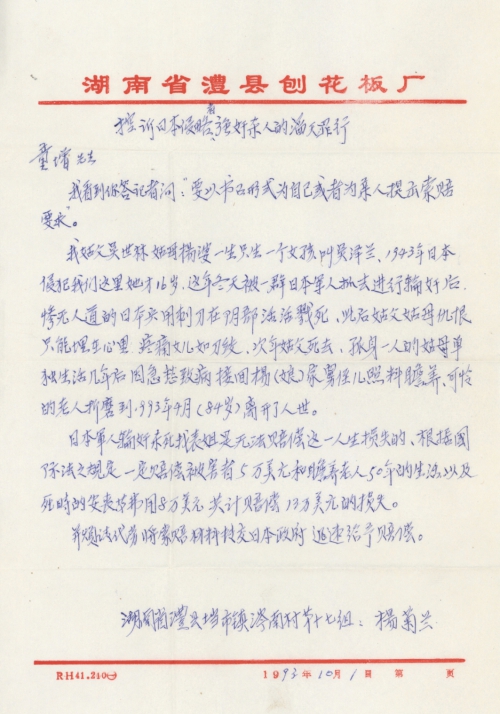 我姑父吴世林,姑母杨婆一生只生一个女孩叫吴泽兰,1943年日本侵犯我们这里她才16岁,这年冬天被一群日本军人抓去进行轮奸后,惨无人道的日本兵用刺刀在阴部活活戳死。此后姑父姑母仇恨只能埋在心里,疼痛女儿如刀绞,次年姑父死去,孤身一人的姑母单独生活几年后因急愁致病,接回杨(娘)家舅侄儿照料赡养,可怜的老人折磨到1993年4月(84岁)离开了人世。