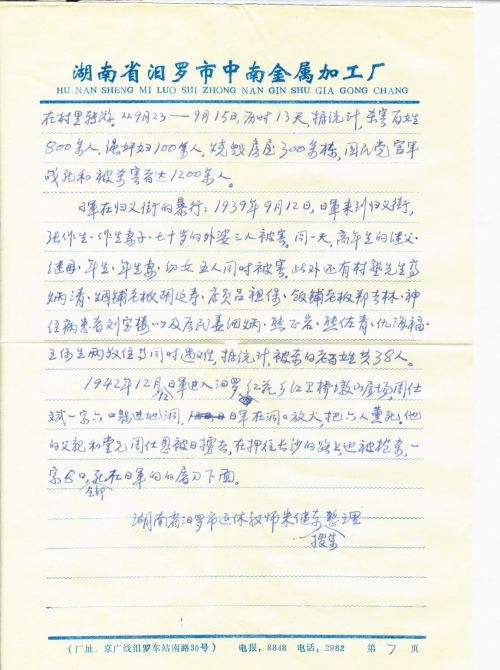 细节:支持对日索赔,支持成立对日索赔组织。寄来收集到的湘阴县受害者统计表。其中有李保生被炸死、王桂生被枪杀、苏翠英遭日军强奸、何刘氏因强奸不从被杀害等受害情况。