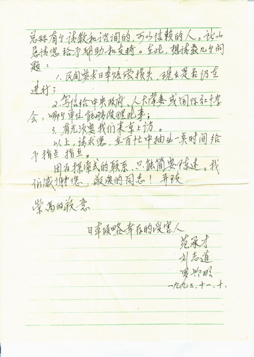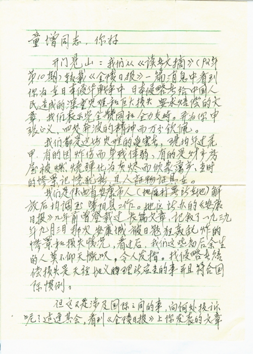 开门见山:我们从《读者文摘》(92年第10期)转载《金陵日报》一篇消息中看到你为在日本侵华战争中日本侵略者给中国人民造成的深重灾难和巨大损失要求赔偿的文章,我们表示完全赞同和全力支持。并为你伸张正义,四处奔波的精神而万分钦佩。
