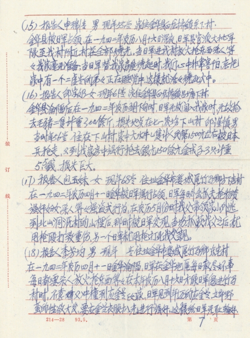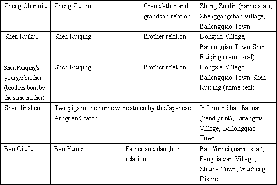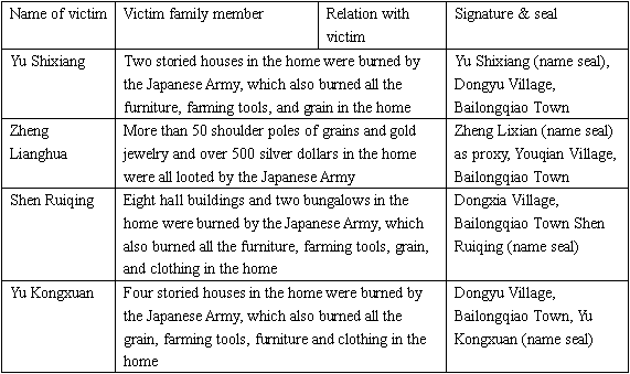 Other details:The materials on many victims are sent here, including: Ying Jinlan was raped by turns by the Japanese soldiers; Zheng Lianghua and other people suffered property loss; Bao Yumei’s father was caught and forced to do hard labor by the Japanese soldiers in 1942, later he was killed.