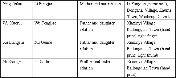 (5)Informer Bao Yumei, female, now 68, Bao Qiufu’s eldest daughter, address: Fangxiadian Village, Zhuma Town, Wucheng District, Jinhua City.