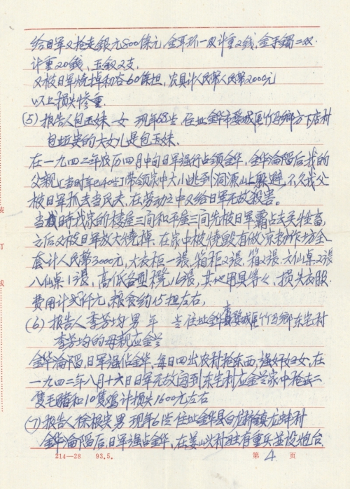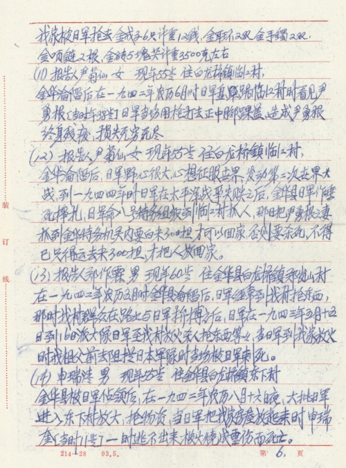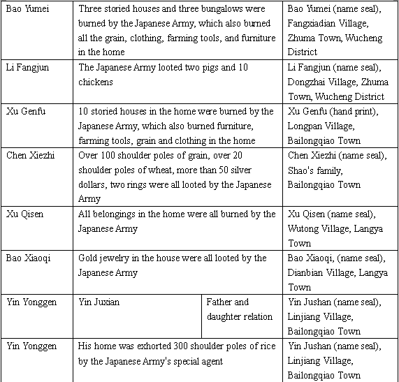On April 11, 1942 on the lunar calendar, Jinhua fell into the hands of the enemy. After the Japanese Army occupied Jinhua, the Japanese Army each day into the rural area to rape women, killed people, burned houses, and looted goods. On August 16 on the lunar calendar the Japanese Army intruded into my home to loot the following things: over 100 catties of grain, over 20 shoulder poles of wheat, 4 pigs weighing over 500 catties, over 30 hens weighing over 80 catties, looted 50 silver dollars, two gold rings weighing 12.5 grams.