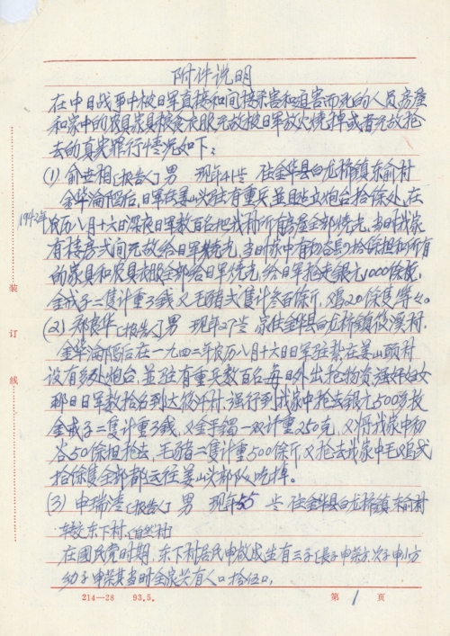 My father (Xu Liangshi), male, back then 57, residing at Huatang Village, Erxianqiao Town, Wucheng District, Jinhua City). After Jinhua fell into the hands of the enemy in July 1942 on the lunar calendar, the Japanese Army arbitrarily demanded my father to contribute rice as military supply grain, but my father was unable to produce any rice, for this reason the Japanese Army beat my father with gun stock to cause serious injury. After returning to home, because back then there was no hospital, and no way to seek medical treatment, my father passed away on the second day.