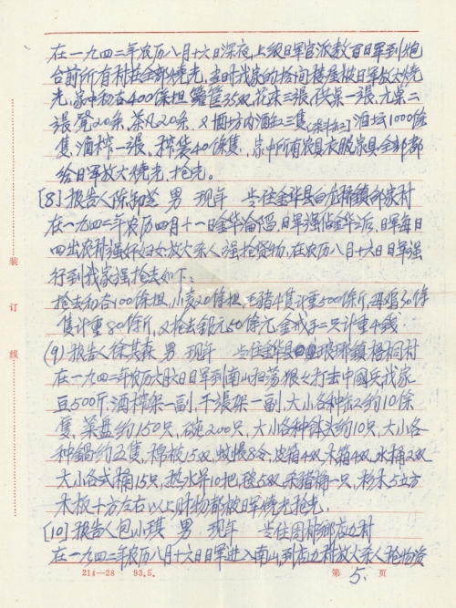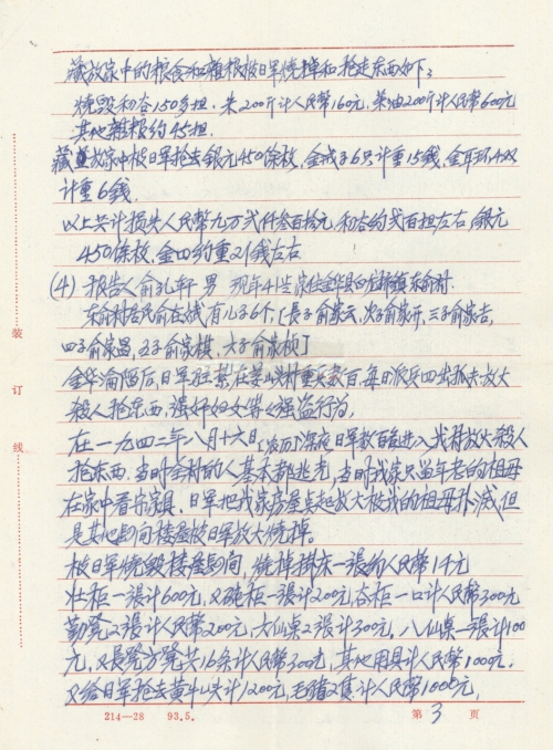 In the mid-night of August 16, 1942 on the lunar calendar, the Japanese Army entered the South Mountains, and came to Dianbian Village to burn, kill and loot materials. My home was looted by the Japanese Army and lost 6 gold rings weighing 37.5 grams, 2 pairs of gold earrings, 2 pairs of gold bracelets, 2 pieces of gold chains, 5 gold bricks weighing about 3500 grams