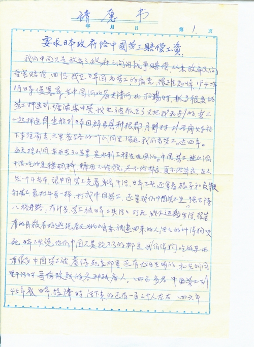 我们中国只是放弃了政府之间的战争赔偿,从未放弃民间受害赔偿,回忆我在日本国当劳工的痛苦,很难忘掉,1942年1月日本侵略军在中国河北省大清河北扫荡时,抓了很多的劳工押送到塘沽集中营,我也被抓去了,又把我和别的劳工一起押送坐船到日本国群马县利根郡月野村,到后闲火车站下车往南走六里多路的一个山洞里,强迫我们当劳工达四年。每天挖山洞,东西长30多里,是水利工程发电用的。中国劳工进山洞干活,吃的是猪饲料,糠团,不给饱,冬不给棉衣,每人发一个兜裆布,让中国劳工光着身体干活,日本工头还拿着棍子和皮鞭打劳工,[像]打牛马一样,打我中国劳工,还骂我们中国劳工是“强古路”、“八格牙路”。有许多劳工被日本工头活活打死,非人道的生活,很苦。有的自杀,有的逃跑后又跳山自杀,被逮回来的人活活的叫洋狗咬死。日本工头说你们中国人是跑不了的,都是我们洋狗吃的东西。有很多中国劳工被虐待死在那里,还有双目失明的,和在山洞里干活时受伤致残的各种残废人。四百多名中国劳工到45年底日本投降时,活下来的还有一百三十人左右。四六年三月,在美军的帮助下,回到祖国,青岛市的红十字会接收站,我们在那里被接收的,不多说。