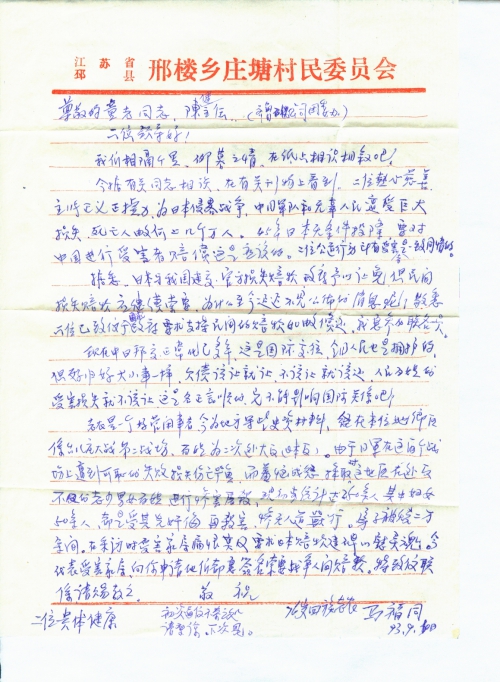 老农是一个好管闲事者,今为地方写些史资材料,经在本位地乡区系台儿庄大战第二战场,百姓为二次处大反(日本反)。由于日军在这两个战场上遭到可耻的失败损失伤亡严重,而羞恼成怒,择取对这地区在处反,不分老少男女百姓,进行惨害屠杀,现初步统计达250多人,其中妇女50多人,都是受其先奸[污],再杀害,惨无人道兽行。房子被烧二万多间。在采访时受害家属痛恨其反,要求日本赔款建碑,以慰灵魂。今代表受害家属,向你申请他们都愿签名索要战争民间赔款,特致信联系,请赐教之。