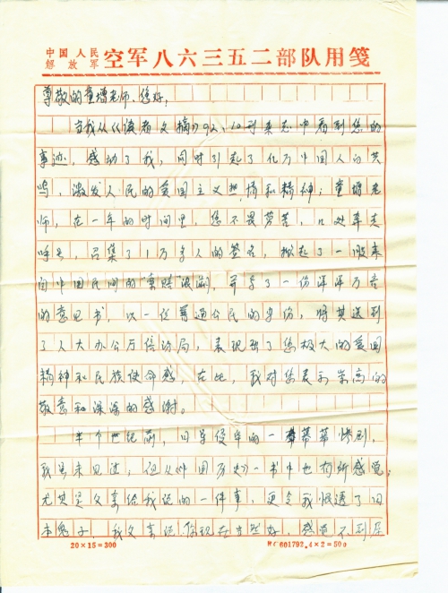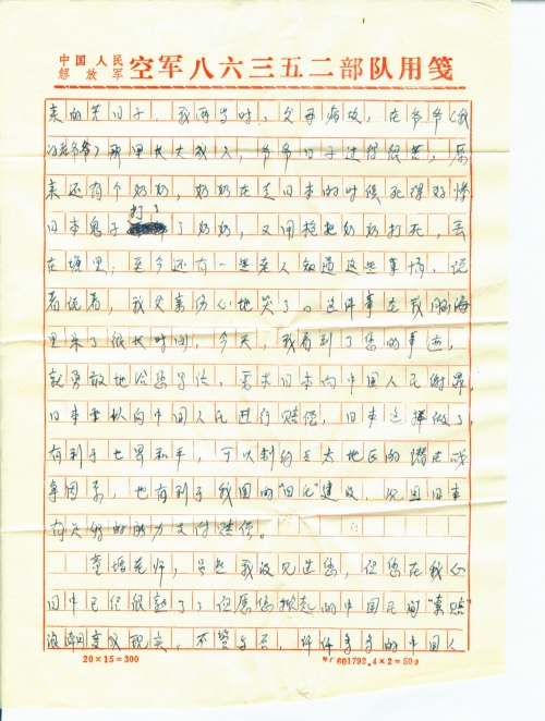 半个世纪前,日军侵华的一幕幕惨剧,我虽未见过;但从《中国历史》一书中也有所感觉;尤其是父亲给我说的一件事,更令我恨透了日本鬼子,我父亲说你现在当然好,感觉不到屈辱的苦日子,我两岁时,父母病故,在爷爷(我的曾爷爷)那里长大成人,爷爷日子过的很苦,原来还有个奶奶,奶奶在走日本的时候死的好惨,日本鬼子打了奶奶,又用枪把奶奶打死,丢在塘里;至今还有一些老人知道这些事情,说着说着,我父亲伤心地哭了。这件事在我的脑海里呆了很长时间,今天,我看到了您的事迹,就勇敢的给您写信,要求日本向中国人民谢罪,日本要向中国人民进行赔偿,日本这样做了,有利于世界和平,可以制约亚太地区的潜在战争因素,也有利于我国的“四化”建设,况且日本有足够的能力支付赔偿。