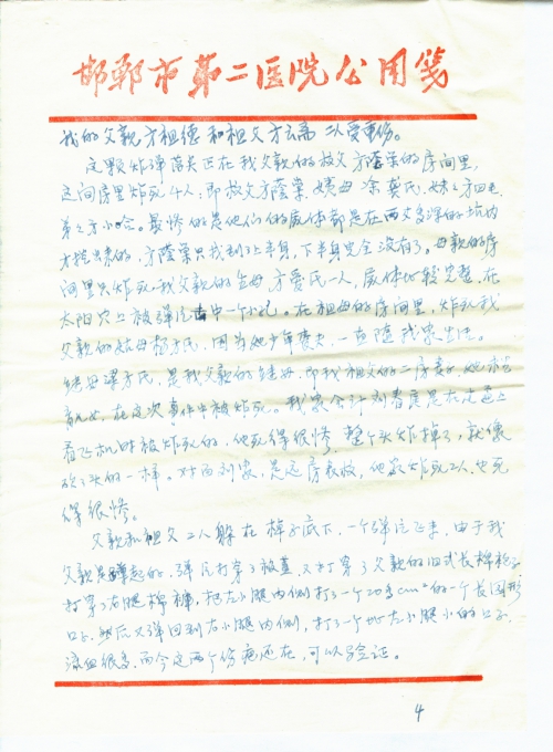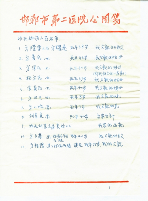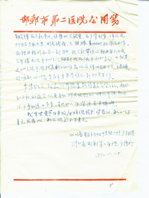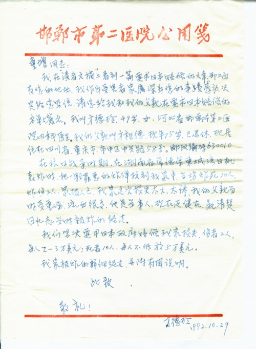 我在“读者文摘”上看到一篇要求日本赔偿的文章,那上面有您的地址。我作为受害者家属深为您的事迹感动,决定给您写信,请您给我和我的父亲在要求日本赔偿的名单上签名。我叫方德玲,49岁,女,河北省邯郸市第二医院内科医生。我的父亲叫方祖德,现年75岁,已退休,现居住在四川省,重庆市,市中区中兴路58号。邮政编码630010。