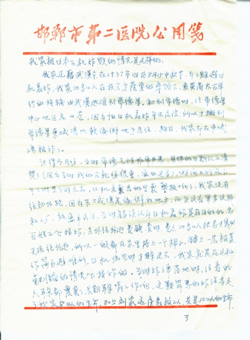 记得冬月份,当时常德气候非常严寒,具体的日期记不清楚了(因为当时我的父亲伤很重,流血过多),时间大约在下午2时至4时左右,日机来袭击的空袭警报响了,我家没有往郊外跑,因为东城湾是偏僻的地方,而且没有军事设施和工厂,纯属平民区,当时错误认为日机轰炸是有目的的,老百姓不会挨炸;另外往外逃费钱、费时、费力,20多口人扶老携幼无法往外逃,所以一般都在家里搭上一个桌子,铺上一层被盖作简易避难所,日机临空时才躲进去,我家就是在这种毫无准备的情况下挨炸的。当时炸弹落地时,活着的人耳朵都震聋了,长期耳朵嗡嗡作响,这颗罪恶的炸弹夺走了我家8口人的生命,加上刘家远房表叔2人,共是10口人的生命。我的父亲方祖德和祖父方云斋二人受重伤。