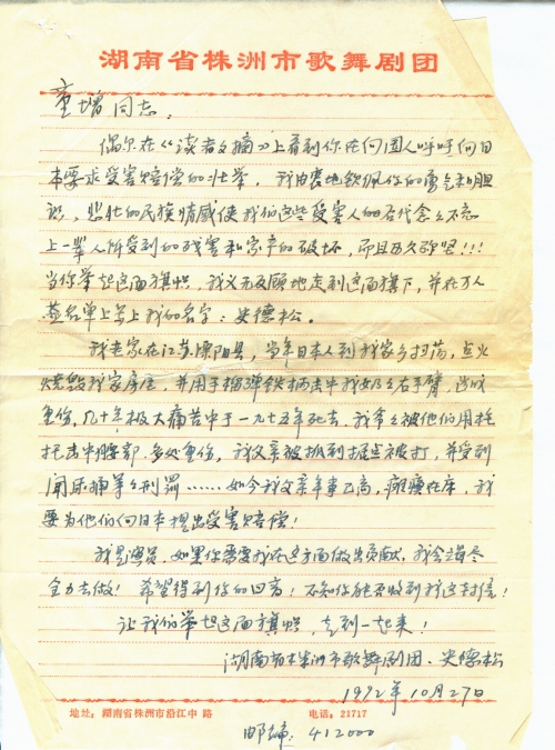 偶尔在《读者文摘》上看到你在向国人呼吁向日本要求受害赔偿的壮举,我由衷地钦佩你的勇气和胆识,悲壮的民族情感使我没们这些受害人的后代念念不忘。上一辈人所受到的残害和家产的破坏,而且历久弥坚!!!当你举起这面旗帜,我义无返顾地走到这面旗下,并在万人签名单上协商我的名字:史德松。
