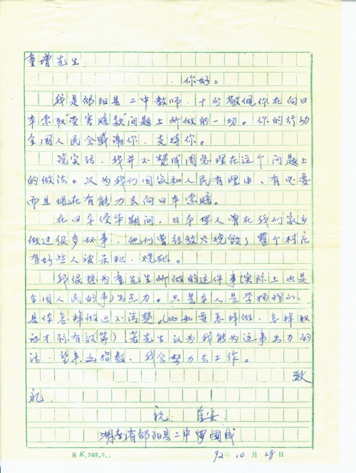 我是邵阳县二中教师。十分敬佩你在向日本索取“受害赔款”问题上所做的一切。你的行动全国人民会感谢你,支持你。