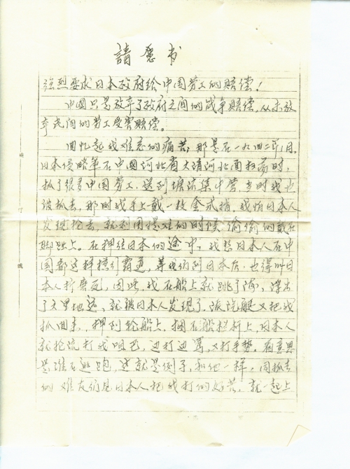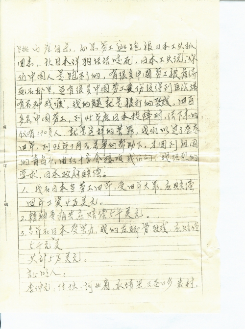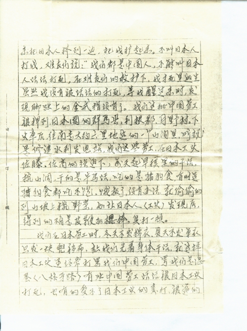 我们在日本劳工时,冬天不发棉衣,夏天不发单衣,只发一块兜裆布,让我们光着身体干活,就这样日本工头还经常打骂我们中国劳工,骂我们是混蛋(八格牙路),有些中国劳工活活被日本工头打死,也有的受不了日本工头的毒打,被逼的跳山崖自杀,如果劳工逃跑被日本工头抓回来,让日本洋狗活活咬死,日本工头说:“你们中国人是跑不了的”,有很多中国劳工被虐待死在那里,还有很多中国劳工受伤没得到医治,落有各种残疾,我的腿就是被打的致残,四百多名中国劳工,到45年底日本投降时,活下来的仅有130多人,就是这样的苦罪,我们竟过了整整四年,到46年3月在美军的帮助下,才回到祖国的青岛市,由红十字会接收我们的。我强烈的要求日本政府赔偿。
