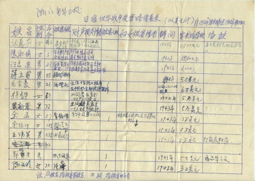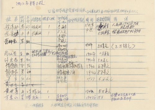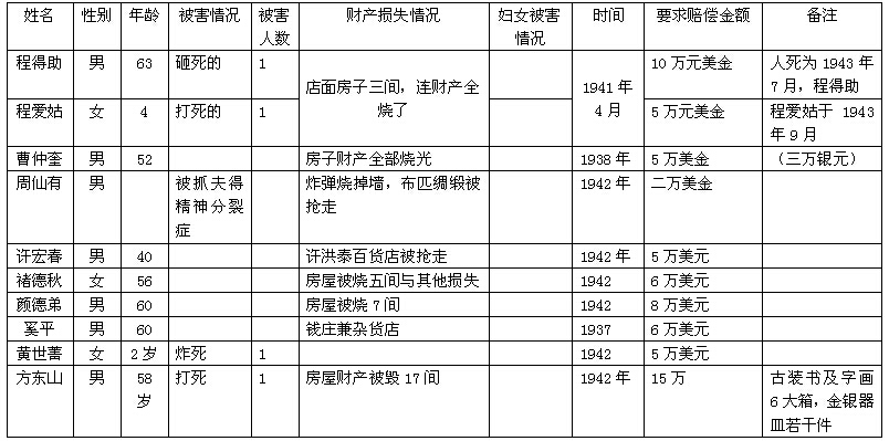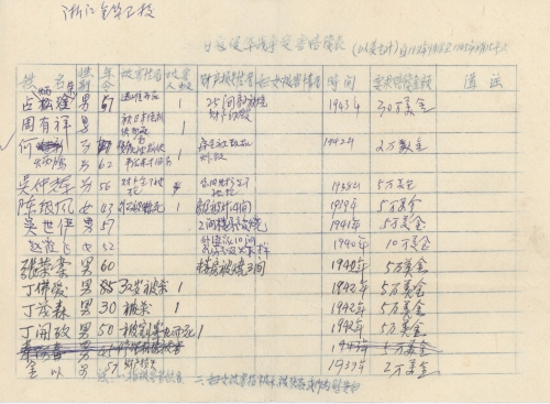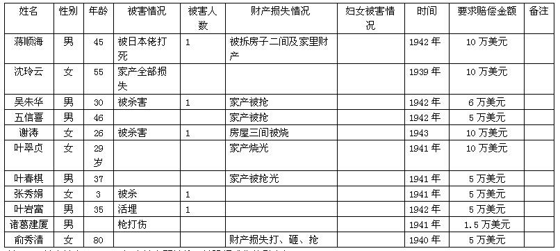 细节:寄来受害者统计表,其中有程爱姑在1943年被杀害;黄世菁被炸死;陈银凤房屋被烧毁;毛宗豪被活埋;王伟英被做细菌实验;陈文玲被强奸等。