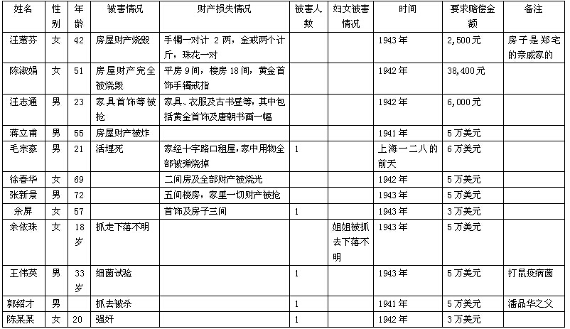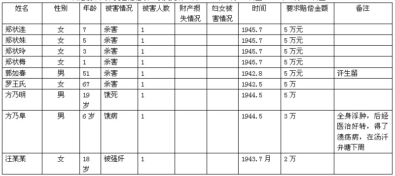 注:1、被害姓名  二、妇女被害即被杀、被强奸或作为慰安妇