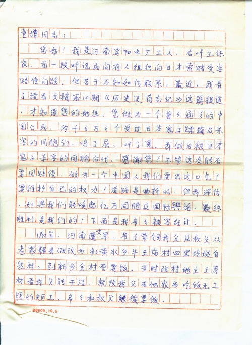 我是河南安阳电厂工人。名叫王保家。前一段听说民间有人组织向日本索赔受害赔偿问题。但苦于不知如何联系。最近,我看了读者文摘第10期《历史没有忘记》这篇报道,才知道您的地址。您作为一个普普通通的中国公民,为千千万万个受过日本鬼子蹂躏及杀害的同胞们,鸣了屈,叫了冤。我作为被日本鬼子杀害的同胞后代,感谢您!不管这次能否要回赔偿。作为一个中国人我们要出这口气!要维护自己的权力!道路是曲折的,但我深信,如果我们能唤起亿万同胞及国际舆论,最终胜利是我们的!下面是我爷爷被害经过。