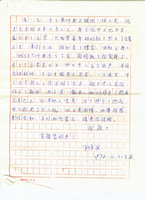 有一天,爷爷来叫我父跟他一块儿走,说去关东给日本人当工人。我父说什么也不去。最后爷爷无奈,只好带着年幼的叔叔坐上了罐子车,来到东北,谁知是下煤窑。因叔父瘦小,他们只叫爷爷下窑,而将叔叔给卖掉了,爷爷十分思念儿子,但日本人看守很严,并设有铁丝网,不让中国劳工出去。一天夜里,爷爷为寻找儿子设法跑了出去,被日本人发现,将爷爷抓回。为了杀一儆百,他们将爷爷拖在马尾巴上,让其他人看着。活活将爷爷拖死。而后扔进了万人坑。以上是简情,如需详情,来信告知。另外如何签名,请来信说明。