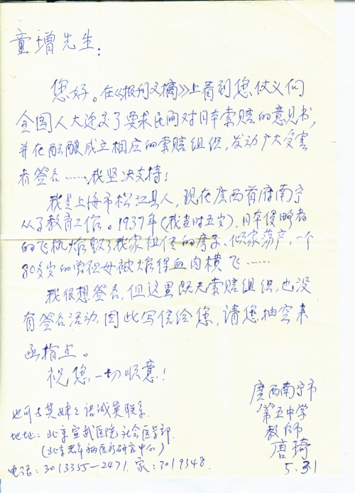 在《报刊文摘》上看到您仗义向全国人大递交了要求民间对日本索赔的意见书,并在酝酿成立相应的索赔组织,发动广大受害者签名……我坚决支持!