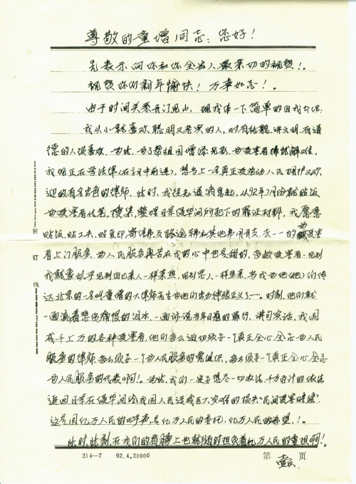 我从小就喜欢聪明又老实的人,对有礼貌、讲文明、有道德的人很喜欢,为此,为了帮祖国增添光彩,为受害者排忧解难,我现在正在学法律(在学习中前进),想当一名真正受劳动人民拥护又欢迎的有名出色的律师,此时,我经知道消息起,从92年7月份就贴饭为受害者代笔,搜集,整理日军侵华间所犯下的罪证材料,我愿意贴饭、贴工夫、贴复印、寄信费及路途车费和其它费用开支,去一一的为受害者上门服务为人民服务再苦在我的心中也是甜的,多数受害者一见到我就像似乎见到自己的亲人一样亲热,见到恩人一样热亲,当我为他(她)们传达北京的一名叫童增的大律师先生为他们出力、伸张正义了……。时刻,他们就一面流着悲伤痛恨的泪水,一面诉说当年日寇的罪行,讲句实话,我国成千上万的各种受害者,他们多么迫切需要一个真正全心全意为人民服务的律师,多么需要一个为人民服务的党组织,多么需要一个真正全心全意为人民服务的代表啊!为此,我们一定要想尽一切办法,千方百计的依法追回日军在侵华间给我国人民造成巨大灾难的损失“民间受害赔偿”,这是国亿万人民的呼声,是亿万人民的委托,亿万人民的希望!