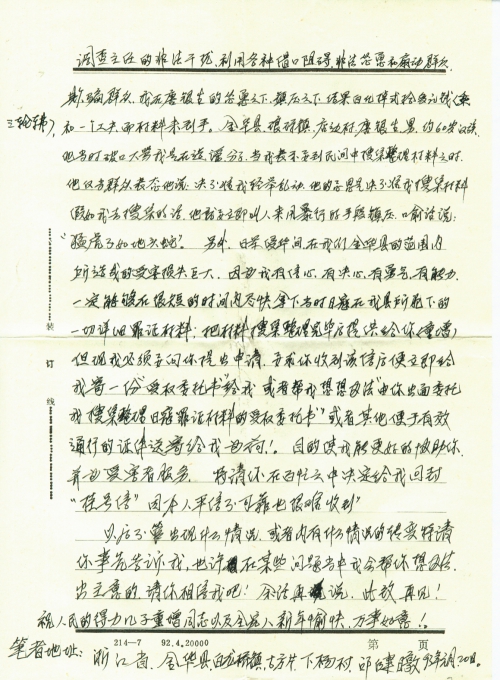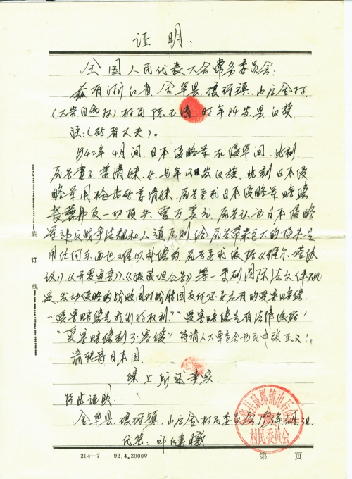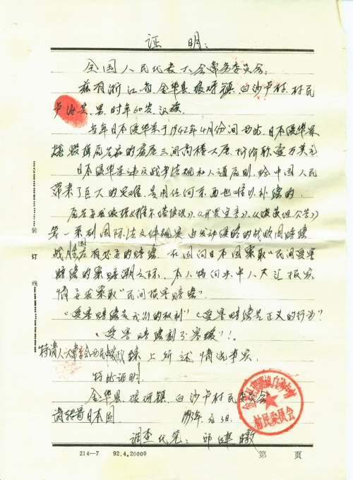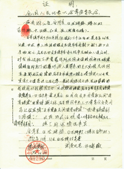 我愿依法全心全意的协助你,对于这一点特请你放心吧!但里面也存在着一些问题,有少数个别受害者,只想要赔偿费,不愿意被人搜集整理日寇的材料,个别不识相、不明白的人也有(不过是少数),在我们金华县范围内,其中内有个别农村村委书记、主任、村会计,他们只管利用职权拿出公款订购各家报纸,但把报纸订购回来后,丝毫也不向本村的广大村民负责,他们自己不看读报,且不让群众看报,把集体公款,订购起来的报纸拿回私用(擦屁股,包装茶叶等乱用),在92年几乎多家报纸都刊登过“国人向日本要求受害赔偿”的报道,而个别干部他们自己不看报不宣传,且不让群众看报,且当我把报纸拿给他们看的时候,他们反冤枉我是自造的,是当地印刷厂印刷的,是假的,并侮辱诽谤我是一名骗子,如浙江金华县琅琊镇,高田藤村村民“金和成”,金华县白龙桥镇高桥村村会计“葛龙潮”,金华县琅琊镇店边村村调解主任“唐银生”,等人他们故意为难我不准我搜集整理此材料,他们一边威胁镇压我,一边公开的向群众做反面宣传,非法对主要干部和群众做反动宣传和怂恿,干扰破坏我的正常工作和生活,损坏我的名誉影响极坏,例如:我经多次调查得知了金华县琅琊镇店边村,该村在日寇侵华间,全村的受害房屋基本被日寇放火烧毁,且该村的许多村民迫切的希望我去搜集整理材料。该村的村委书记也表示同意,当时并表示支持,我于1993年元月17日冒迎着冰冷的雪天我光花掉三轮车车费十多元(自付)百里滔滔来到(特意来到)深山老林里,目的是为搜集整理日寇的材料,即日结果遭到了店边村调查主任的非法干扰,利用各种借口阻碍,非法怂恿和煽动群众,欺骗群众,我在唐银生的怂恿之下,镇压之下,结果白花掉二十多元钱(乘三轮车费),和一个功夫而材料未到手。金华县琅琊镇店边村,唐银生,男,约60多岁,汉族,他当时破口大骂我是造谣分子,当我表示要到民间总搜集整理材料之时,他反当群众表态他说:绝不准我轻举乱动,他的意思是绝不准我搜集材料,假如我去搜集的话,他就要立即叫人来用暴行的手段镇压,喻话说:“猛虎不如地头蛇”。另外,日军侵华间,在我们金华县的范围内所造成的受害损失巨大,因为我有信心,有决心,有勇气,有能力,一定能够在很短的时间内尽快拿下当时日寇在我县所犯下的一切详细罪证材料,把材料搜集整理完毕后提供给你(童增),但现在我必须要向你提出申请,要求你收到该信后便立即给我寄一份“授权委托书”给我或者帮我想想办法“由你出面委托我搜集整理日寇罪证材料的授权委托书”或者其他便于有效通行的证件送寄给我为荷!目的使我能更好的协助你,并为受害者服务,特请你在百忙中决定给我回封“挂号信”因本人平信不可靠也很难收到。
