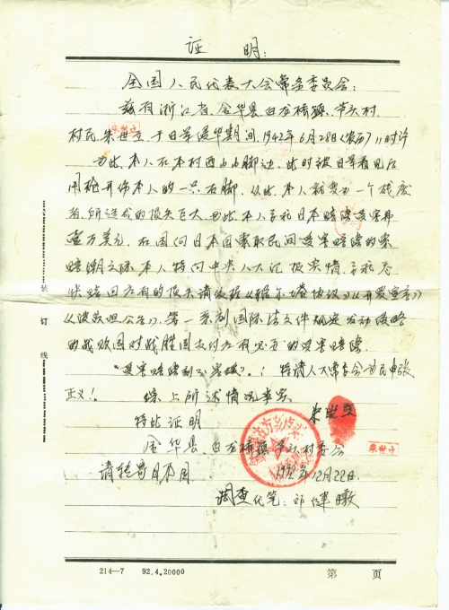 兹有浙江省金华县白龙桥镇芦头村村民朱世立(人名章),于日军侵华期间,1942年6月28日(农历)11时许,为此,本人在本村西山山脚边,此时被日军看见后用枪耳伤本人的一只右脚,从此,本人就变为一个残废者,所造成损失巨大,为此,本人要求日本赔偿受害费一万美元,在国向日本国索取民间受害赔偿的索赔潮之际,本人特向中央人大汇报实情,要求尽快赔回应有的损失,请依据《雅尔塔协议》《开罗宣言》《波茨坦公告》等一系列国际法文件规定发动侵略的战败国对战胜国支付应有必要的受害赔偿。