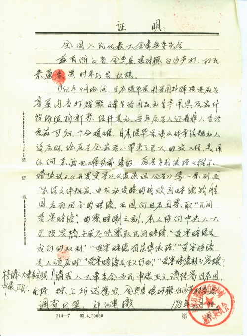 特请人大常委会为民伸张正义!请求人大常委会为民伸张正义,请转寄日本国,此据,综上所述属实。