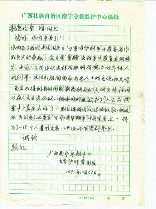 你们为了我们中国国民在“日军侵华战争”中受害者做出巨大奉献,向日本索赔在战争中受害者的损失,中国人民有你们这样有胆略有魄力的年轻人的创举,不仅引起国内外各界人士的重视和共鸣,而且也得到我们国家最高领导机关的支持,(全国七届人大五次会议,把你们的建议书列到正式提案中)真是太好了!更值得我们向你们致敬,致谢。我(黄彩兵)也是在“日军侵华战争”中受害者之一。特写了一份个人遭难史实,供你们作资料参考。