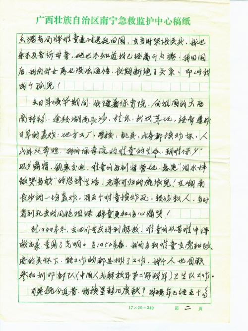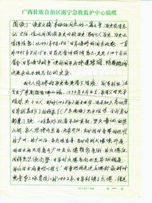 我个人悲惨的历史总是留下泪痕!我(黄彩兵)出生在广东南海县佛山镇,1934年4月出生,家有父母兄弟姐妹共十口人,那时(1938年)我才四岁,还不知天高地厚,日军就轰炸了我的家乡(广东南海)兄弟姐妹,全民老幼都遭了秧,一场轰炸死者不知其数,哭天嚎地,血染山河,家人悲惨各东西,无家可归,当时我母亲带我逃难到广州,到广州后,亦无法安身,当时因战火环境所逼,我母女两只有离开广州区香港投靠亲戚,到香港后,同样是紧张局势,日军对香港当局也是军政相逼,我们母女两更难以维生!母亲把我送进香港粉岭战时儿童第二保育院。到1942年,日军封锁了香港,强迫香港当局将难童速时送返回国,在当时紧张关头,我也来不及告诉母亲,她也不知道我已经离开香港,我回国后,我们母女再也没法通信,长期断绝了关系,即此我成了一个孤儿!