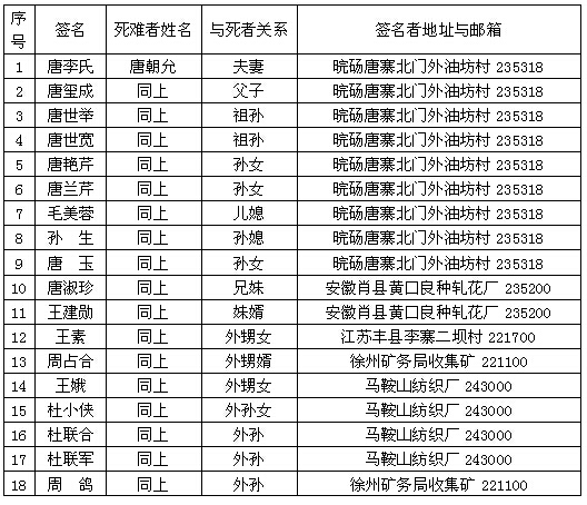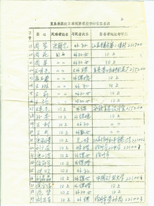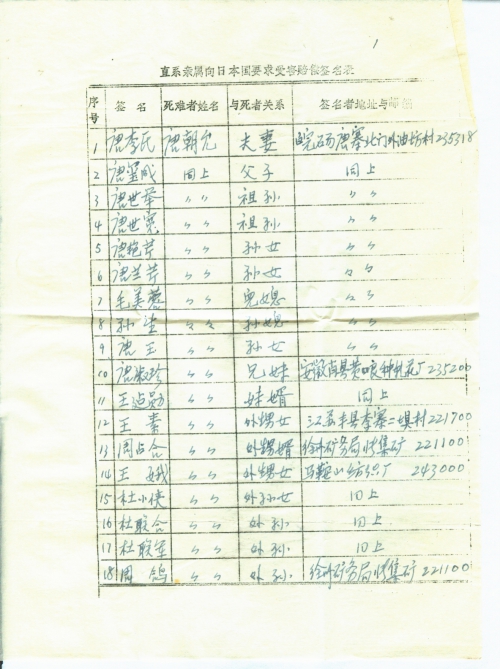 细节:1938年初夏,日军侵略我家乡唐寨镇,实行三光政策,4月18日,我丈夫被日军杀害。并寄来支持索赔签名。