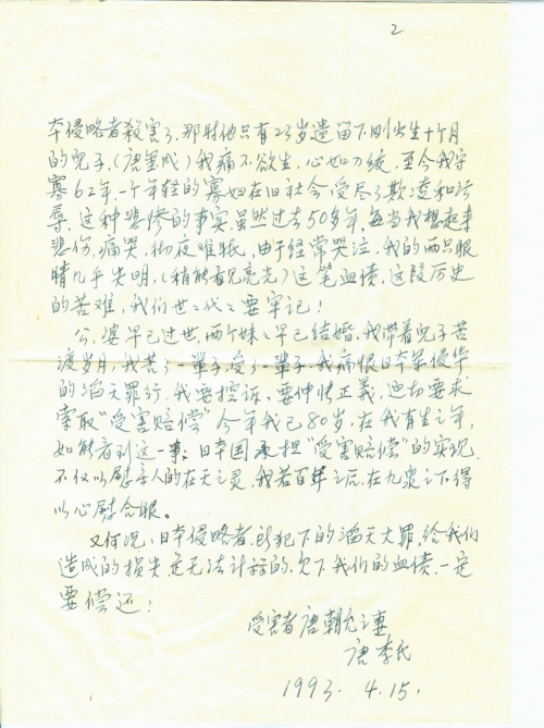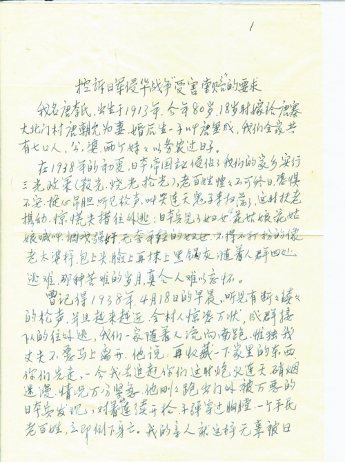 公,婆早已过世,两个妹妹早已结婚,我带着儿子苦渡岁月,我苦了一辈子,受了一辈子,我痛恨日本军侵华的滔天罪行,我要控诉,要伸张正义,迫切要求索取“受害赔偿”今年我已80岁,在我有生之年,如能看到这一事;日本国承担“受害赔偿”的实现,不仅以慰亲人的在天之灵,我若百年之后,在九泉之下得以[欣]慰合眼。