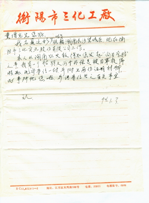 本人从湖南妇女报得知您发起“向日索赔”之事,我有一个姑妈及两个外侄是被日军投弹炸死,现寄来信一封,并附上两份证明材料,此事拜托您啦,并请来信告之有关事宜。