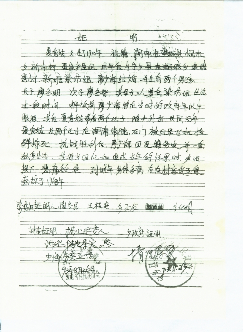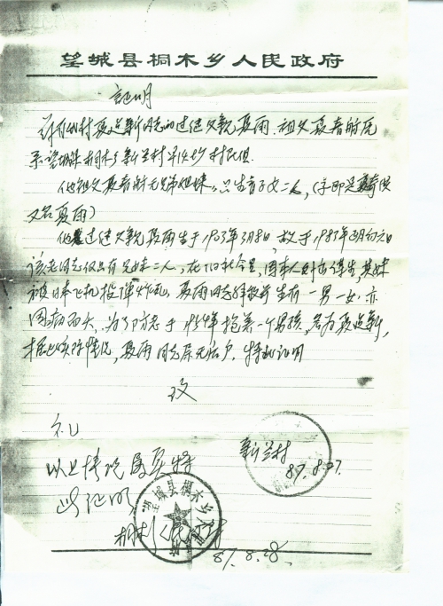 细节:夏建新的继父是夏雨,夏雨的妹妹叫夏秀姑,在民国33年(1944年)夏秀姑及其2个儿子在湖南省常德市被日军轰炸致死。信中有村委盖章证明。