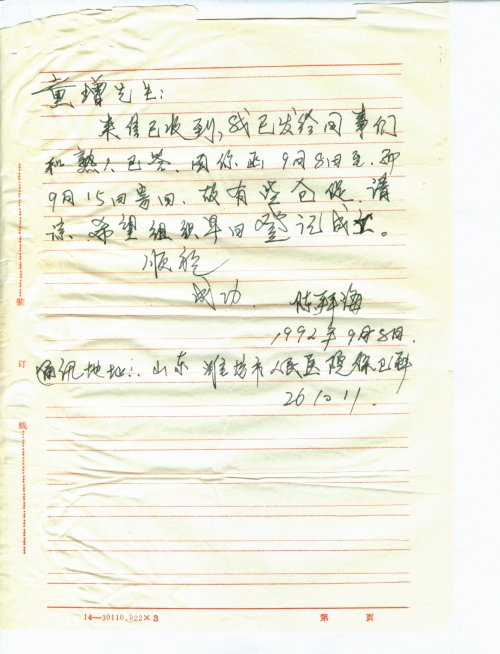 21 10 月, 2018 s2685 Share EmailTwitterFacebookGoogle +PinterestTumblrLinkedinVkontakte 信扫描序列号:s2685 写信日期:1992-09-08 写信地址:山东省廊坊市 受害日期:无 受害地址:无 写信人:陈拜海 受害人:无 类别:其它(OT) 细节:您来信我已经收到,希望索赔组织早日成立。 童增先生: 来信已收到,我已发给同事们和熟人已答,因你函9月8日至,而9月15日寄回,故有些仓促,请谅,希望组织早日登记成立。 顺祝 成功 陈拜海 1992年9月8日 通讯地址:山东滩访市人民医院保卫科 261011 21 10 月, 2018 10000cfj_3o5som 其它(OT)